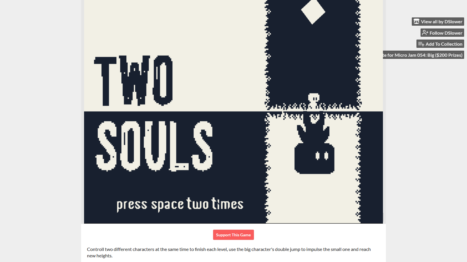 Controll two different characters at the same time to finish each level, use the big character's double jump to impulse the small one and reach new heights.